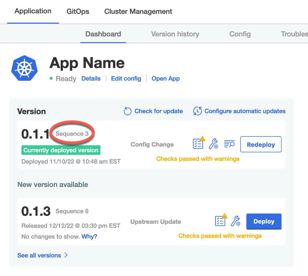 When a new version is available for upgrade, including when KOTS checks for upstream updates as well as when the user syncs their license or makes a config change, the KOTS Admin Console assigns a unique instance sequence number to that version. The instance sequence in the Admin Console starts at 0 and increments for each identifier that is returned when a new version is available.