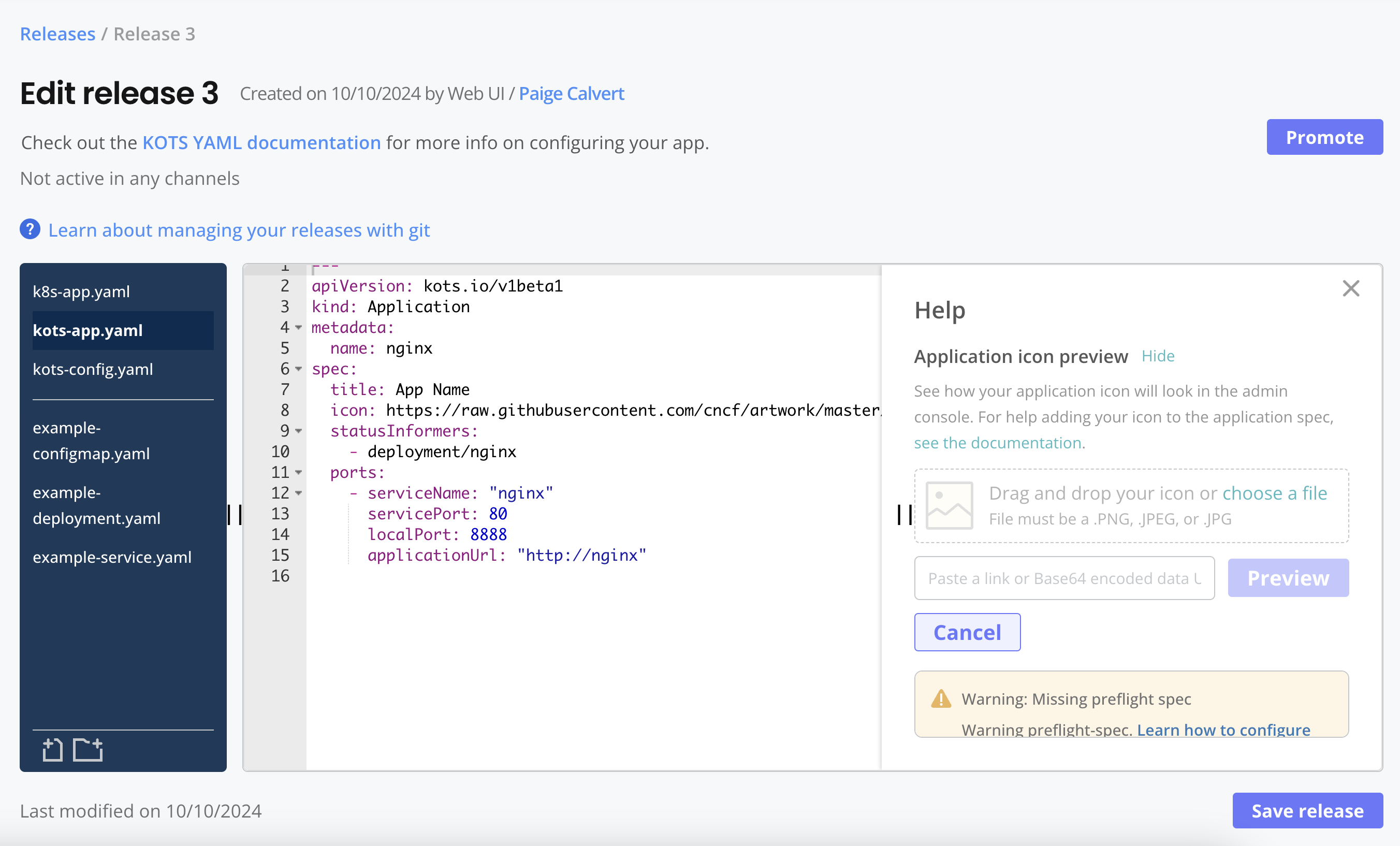 4. Create and promote a new release with your changes. For more information, see Manage Releases with the Vendor Portal or Managing Releases with the CLI.